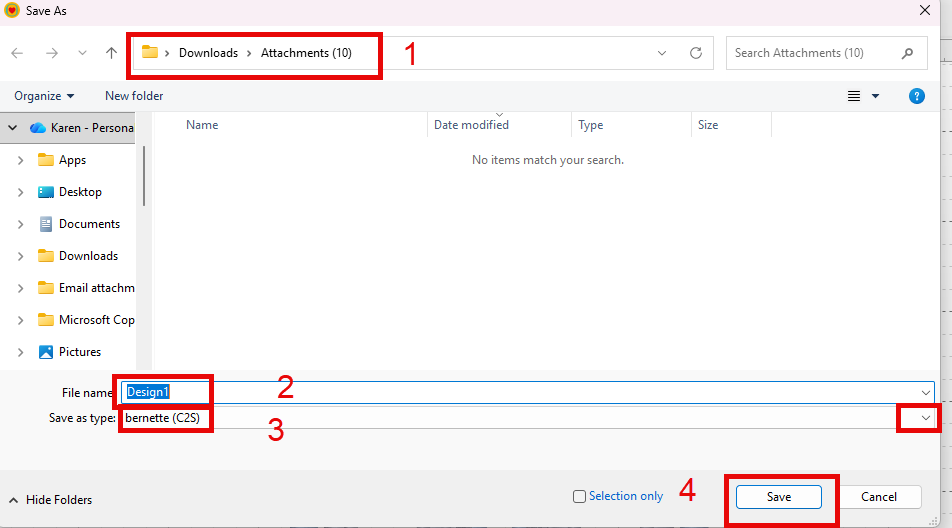 - Choose the location where you want to save the file. (see 1 below)